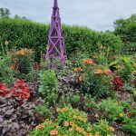 The raised beds leading to the Haggerty Education Center (HEC) are planted with a wide variety of colorful annuals, such as calibrachoa, elephant ears, snapdragon, etc. When you visit, be sure to look for the sign in the bed identifying each plant. The purple tuteurs in the beds provide a nice focal point and contrast to the many red, orange and yellow flowers.